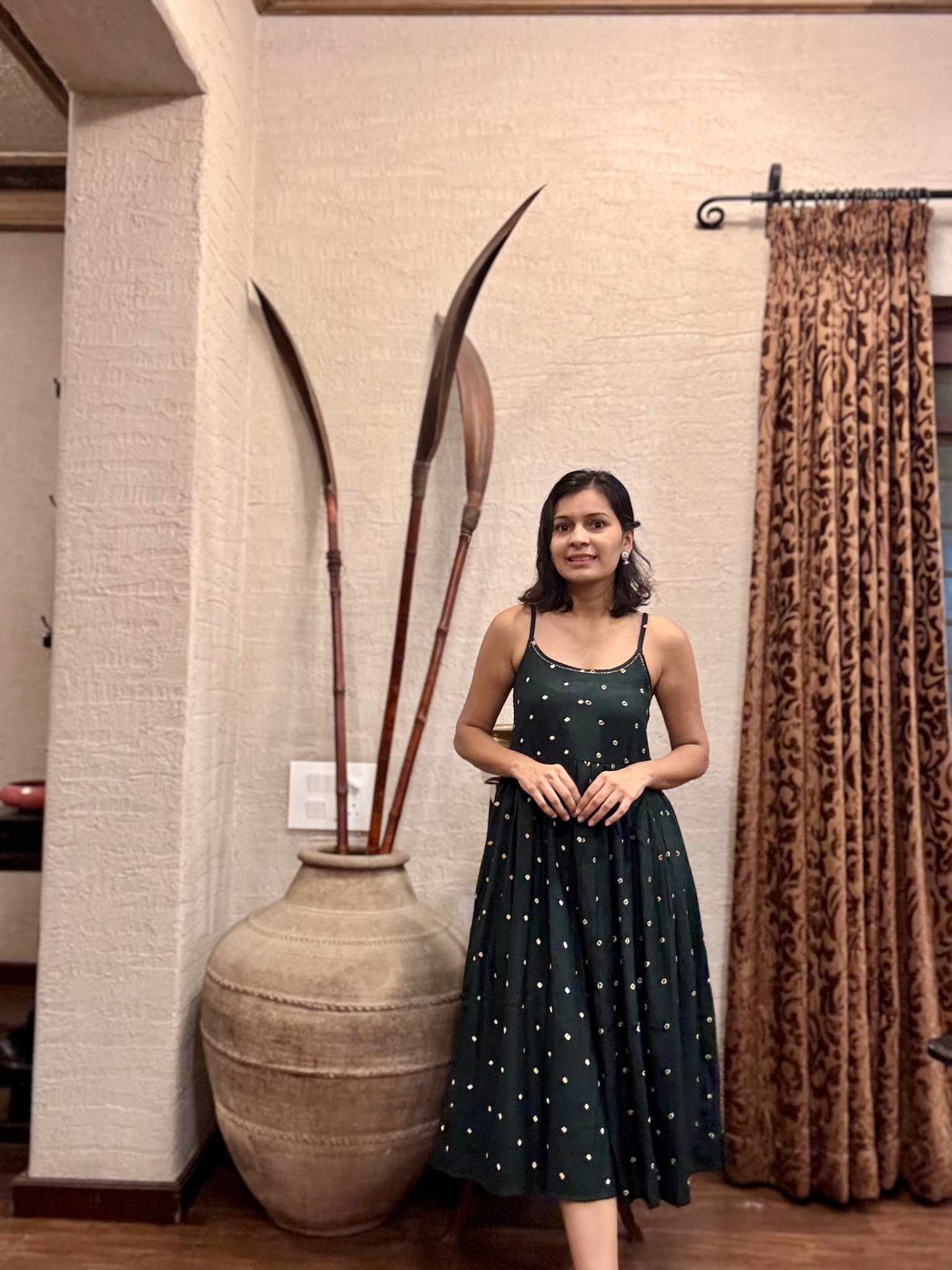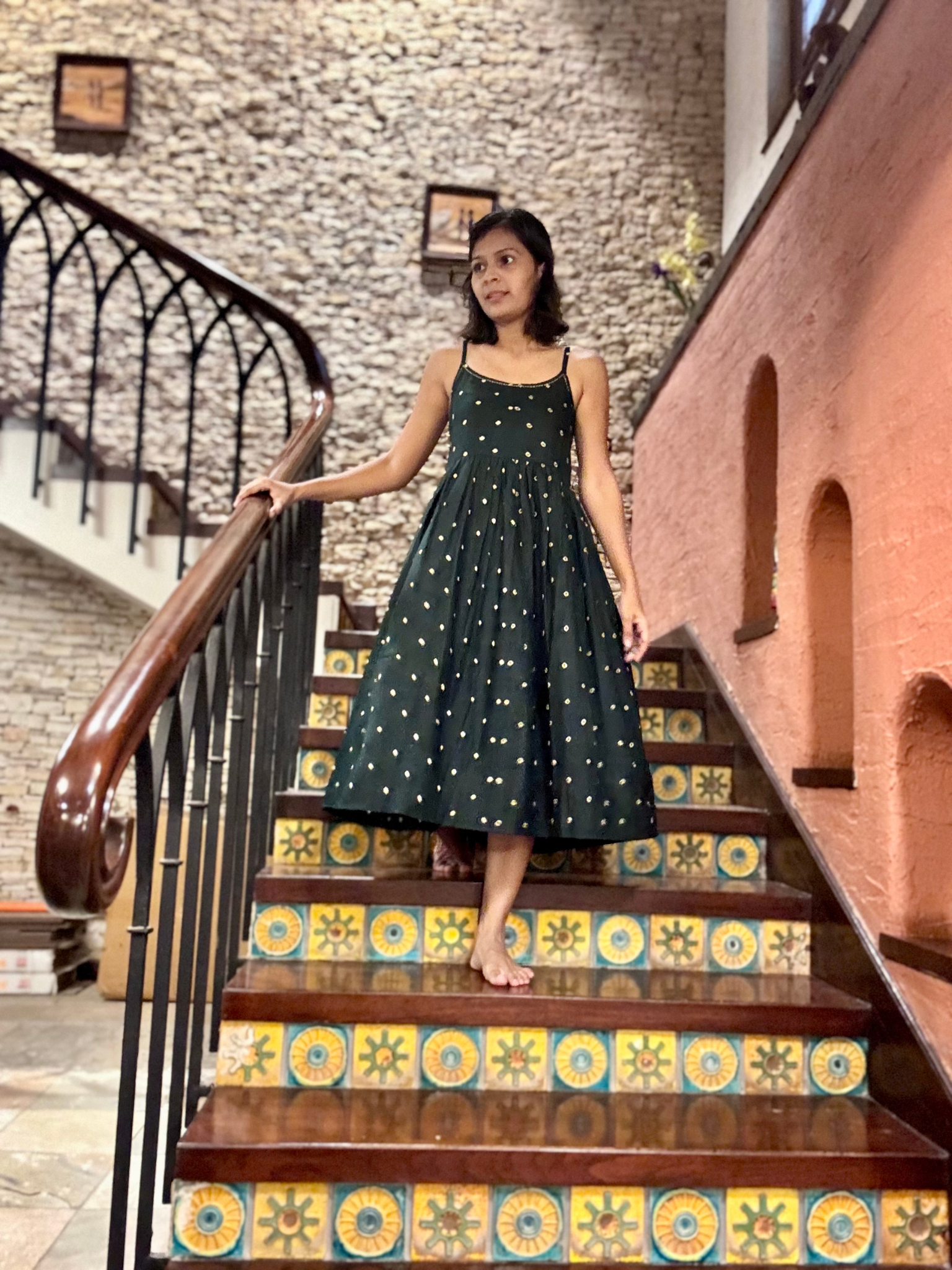Stay comfortable and stylish in our Cotton Bandhani Strappy Dress, made from soft cotton Bandhani fabric from Gujarat. It features hand embroidery on the neckline, adjustable shoulder straps, and an elastic back for a perfect fit. The dress comes with full lining, making it light, breathable, and easy to wear all day. A beautiful blend of tradition and comfort – perfect for everyday moments.