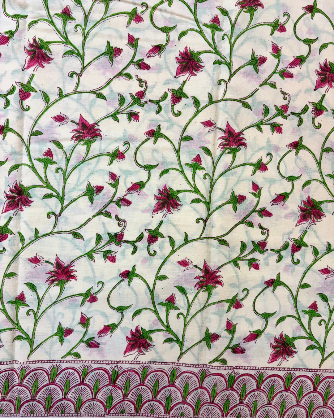 Experience the elegance of traditional Indian craftsmanship with our hand-block printed cotton saree. This saree features a delicate floral pattern in rich hues of pink and green on a soft, off-white base. The intricate motifs are inspired by nature, bringing a timeless charm to your wardrobe. The border showcases a detailed scallop design, enhancing the beauty of the overall look.