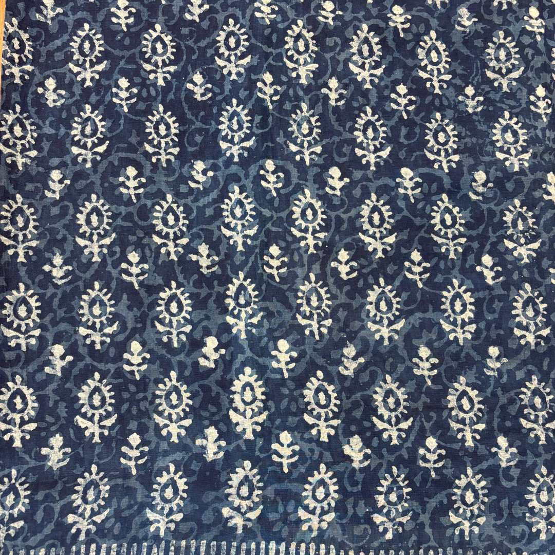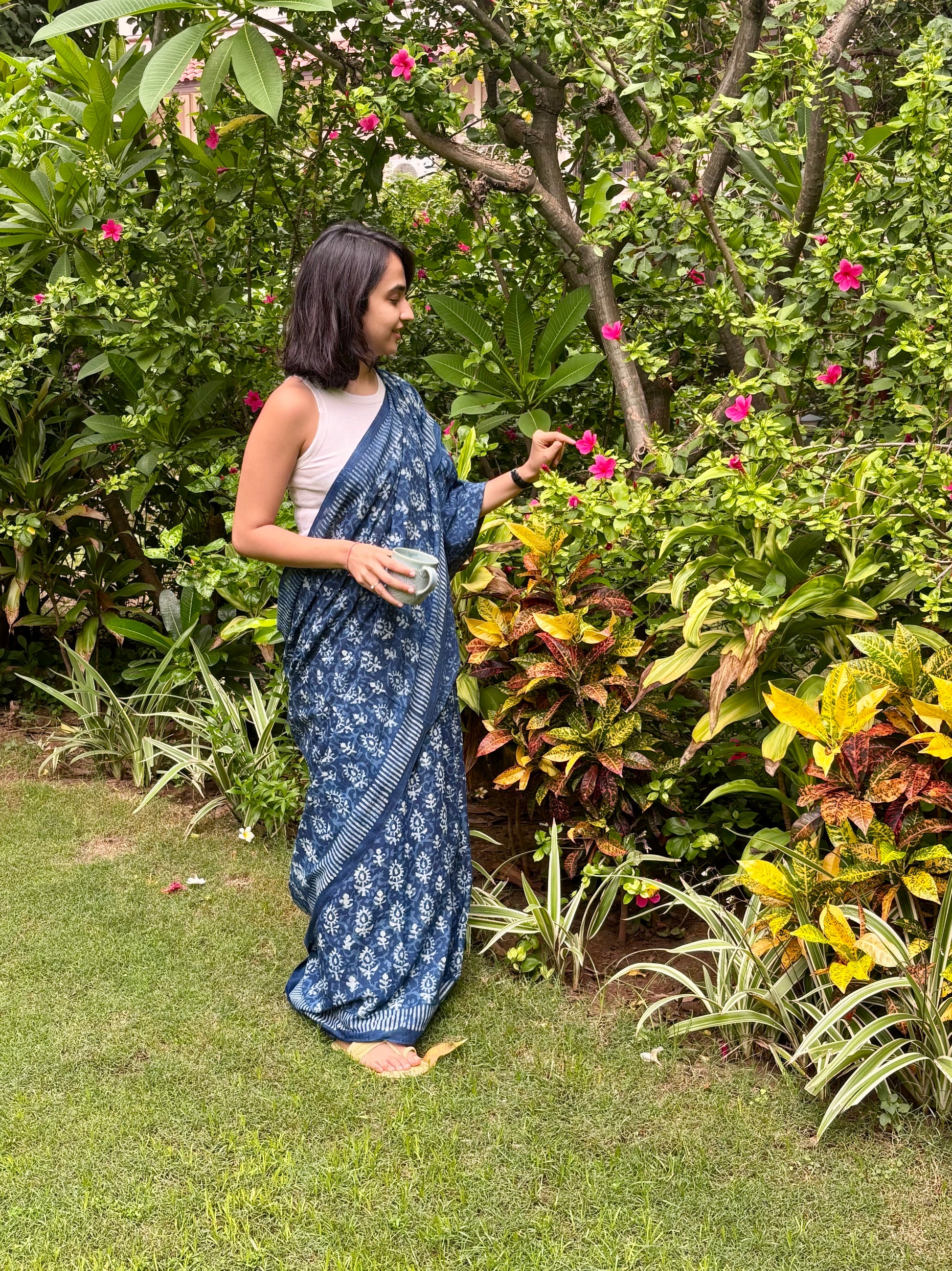Elevate your wardrobe with this exquisite hand-block printed indigo cotton saree. Crafted from soft and breathable cotton, it drapes beautifully, perfect for all-day wear.