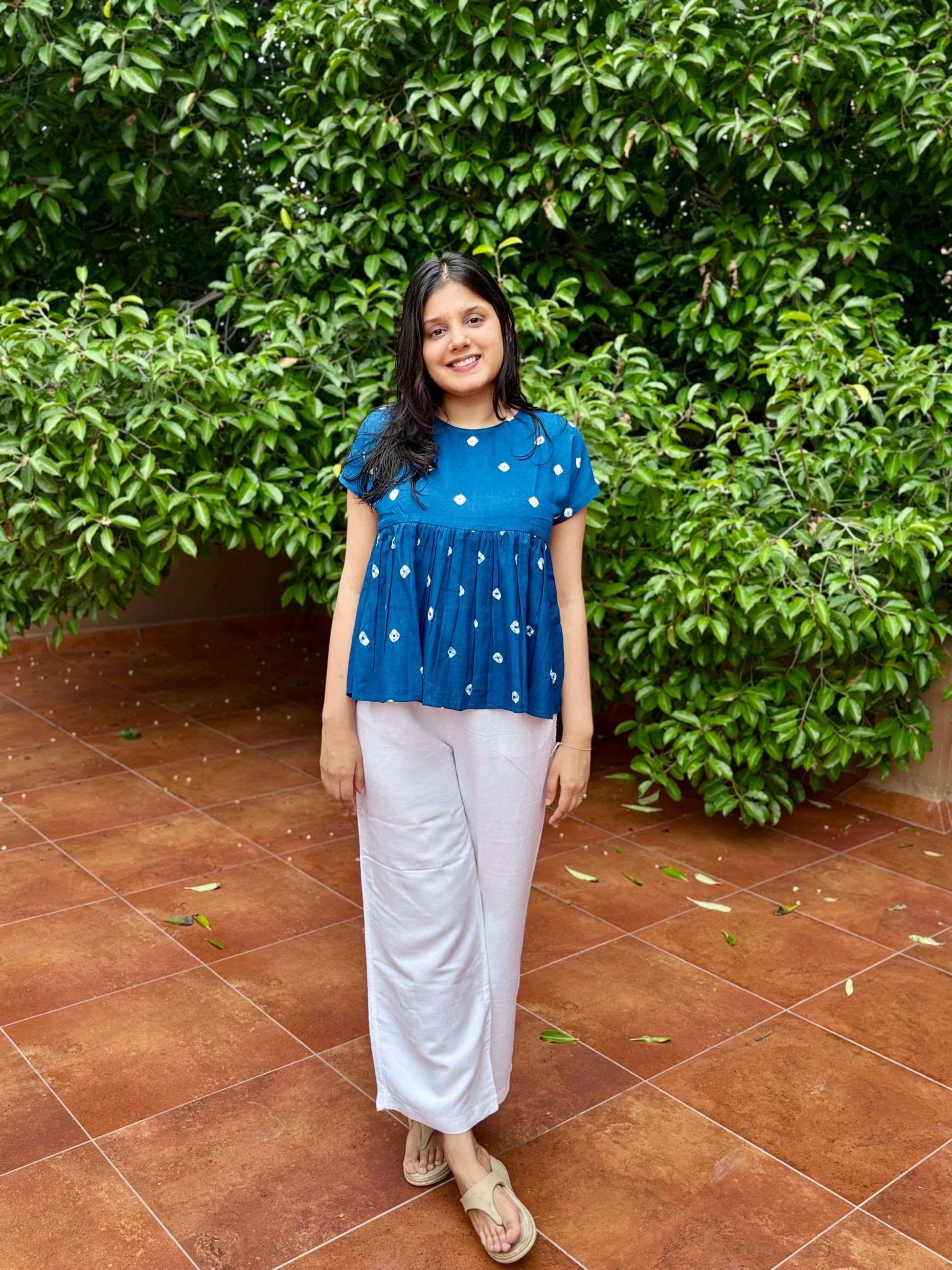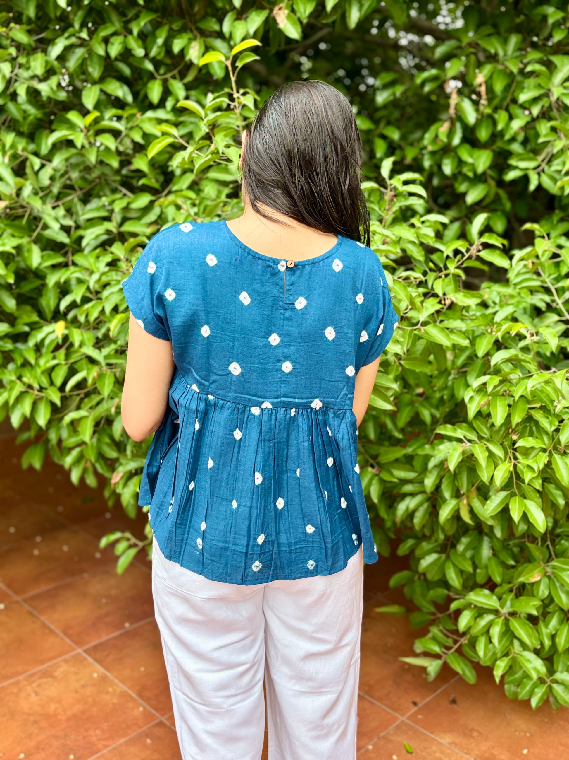 Crafted in soft, breathable cotton, our leher mint cotton Bandhani Peplum Top is designed for effortless everyday comfort. Featuring traditional hand-tied Bandhani patterns, this free-size silhouette fits beautifully across body types. The relaxed peplum style adds a flattering flare, while the buttonhole detail at the back brings a subtle finish.
