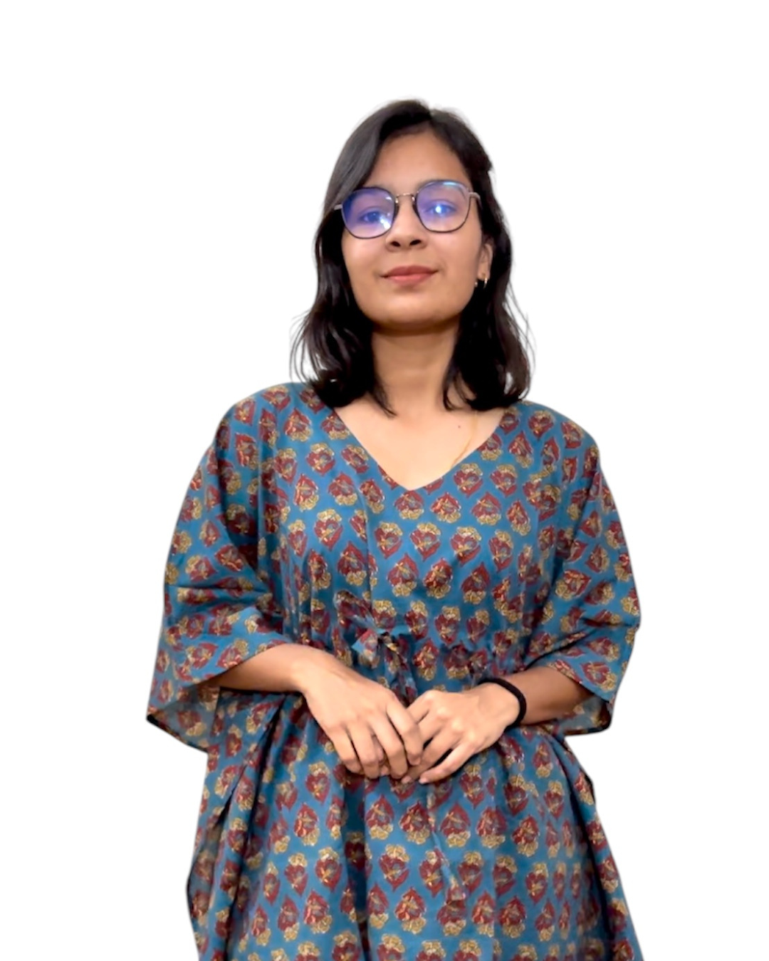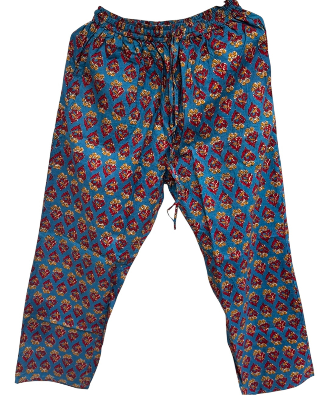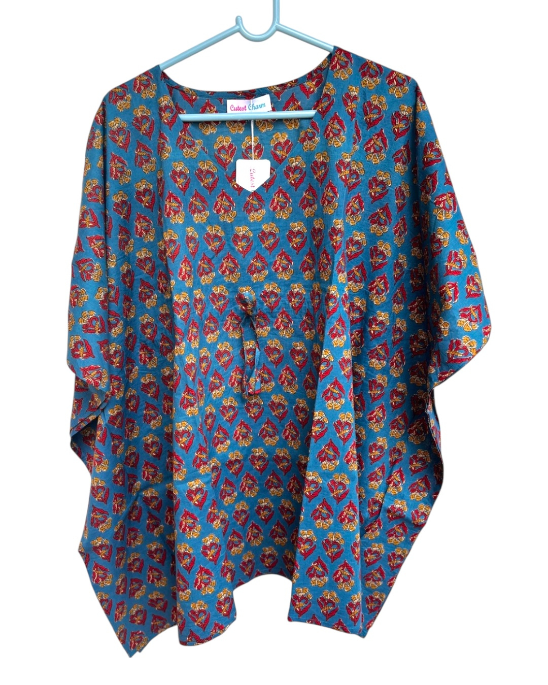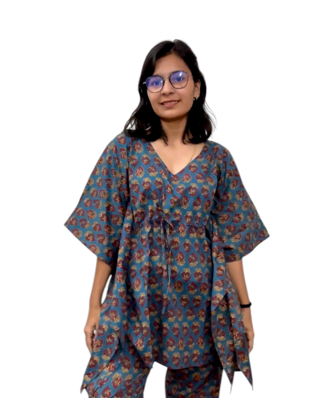 Crafted in soft cotton, this floral coord set comes in a soothing mint base with intricate hand-block prints in shades of red and yellow. The free-size kaftan-style top features a relaxed silhouette with a cute front tie detail, paired with comfortable straight pants that have an adjustable drawstring waist.