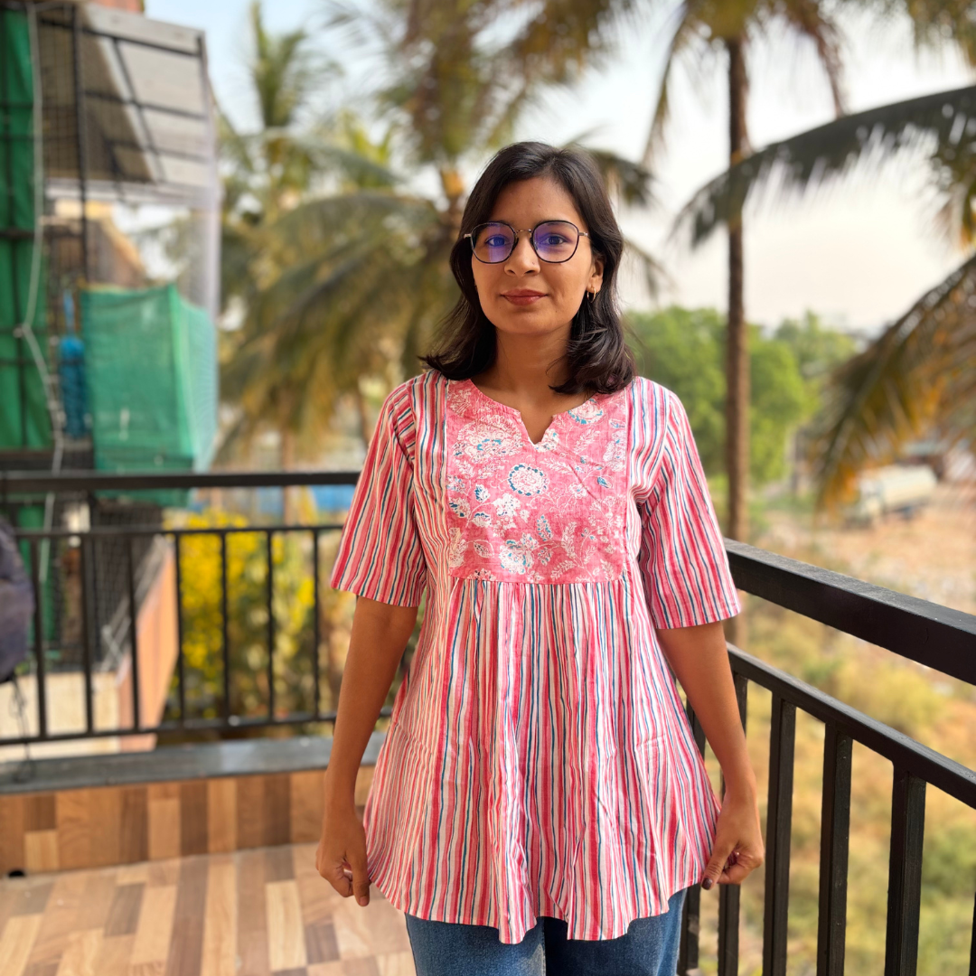 Brighten up your everyday wardrobe with this playful and comfy pink stripe printed short Kurti. Made from soft, breathable cotton, it features vertical multicolored stripes and a beautifully printed yoke that adds just the right pop of detail.
