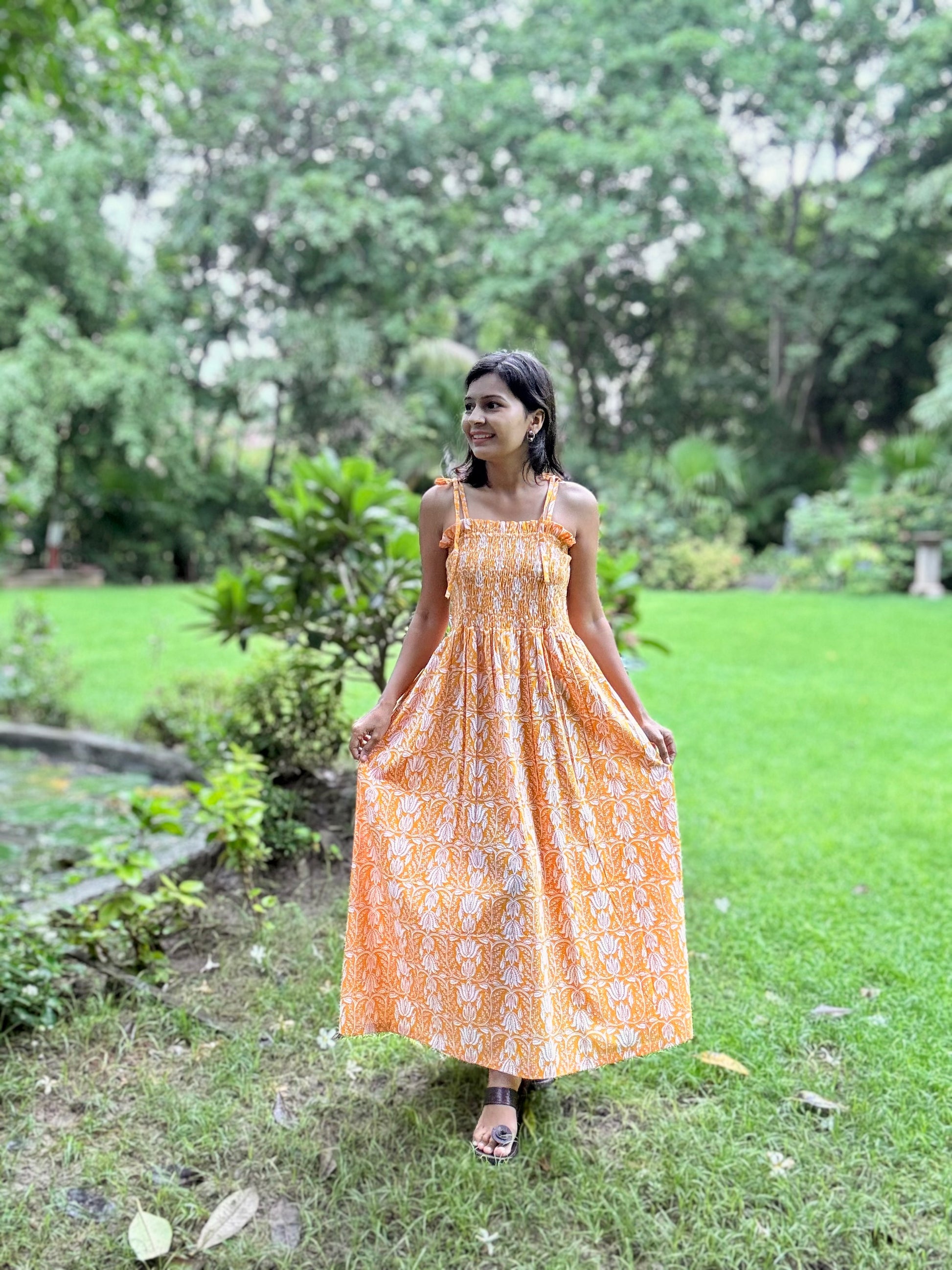 The Saanjh yellow Block Printed Smocking Strappy Dress is a perfect blend of comfort and charm, crafted in soft cotton with intricate hand block prints. It features a beautifully smocked bodice with delicate shoulder straps, giving it a flattering and easy fit. The flowy, ankle-length silhouette makes it light and breezy, ideal for casual days, brunches, or relaxed getaways. Designed thoughtfully, it also comes with pockets, adding a touch of functionality to its effortless style.