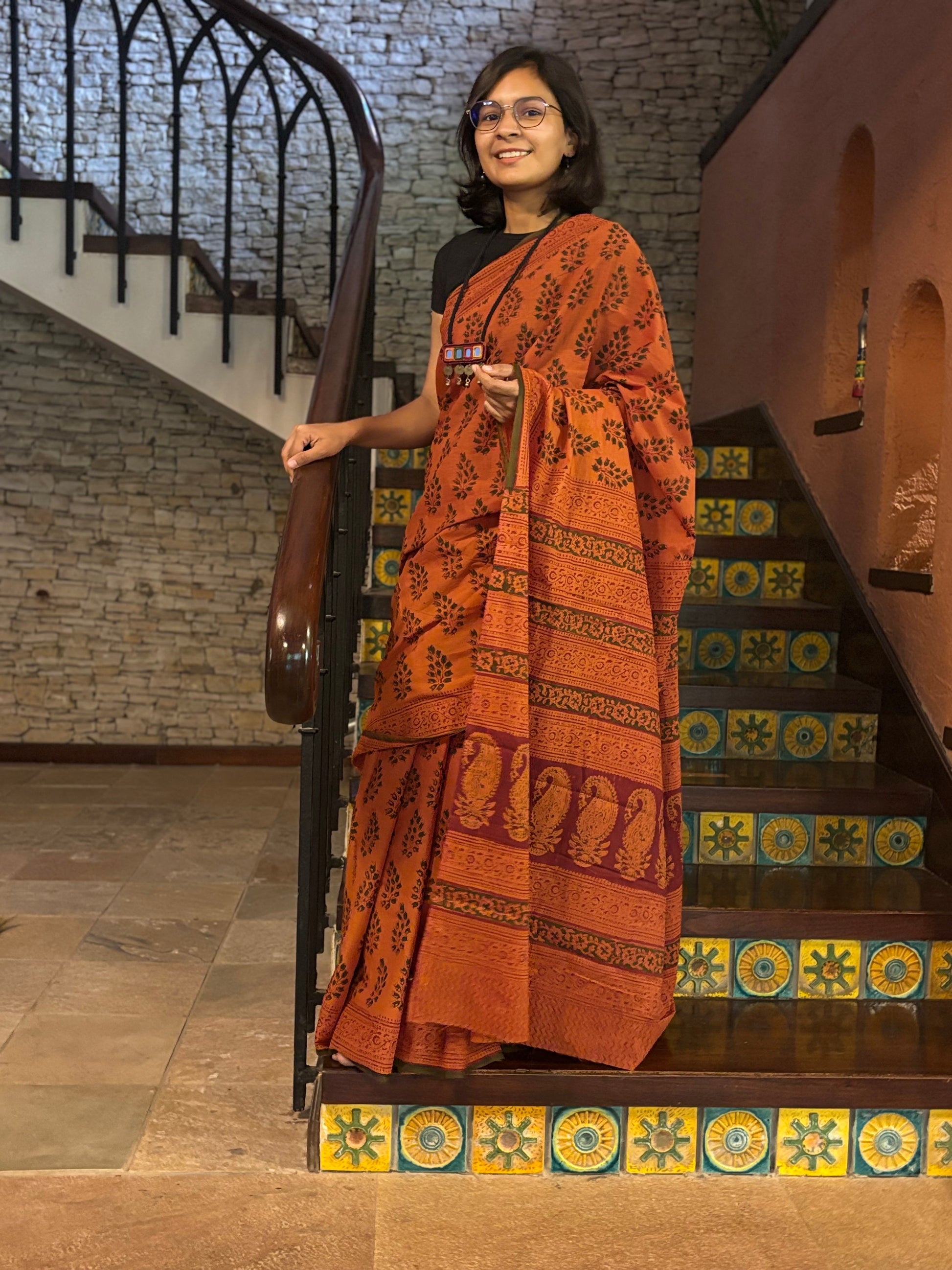 Discover the rustic charm of our Terracotta Hand-Block Leaf Saree, a tribute to nature-inspired artistry. This saree features a warm terracotta-orange base adorned with rhythmic charcoal leaf motifs, finished with a traditional paisley-printed pallu. Hand-printed on soft, breathable cotton, it offers a relaxed yet elegant silhouette that transitions beautifully from a morning in the garden to an evening out. Simple, timeless, and rooted in tradition, it’s the perfect addition to a sustainable wardrobe for those who love earthy tones and effortless style.