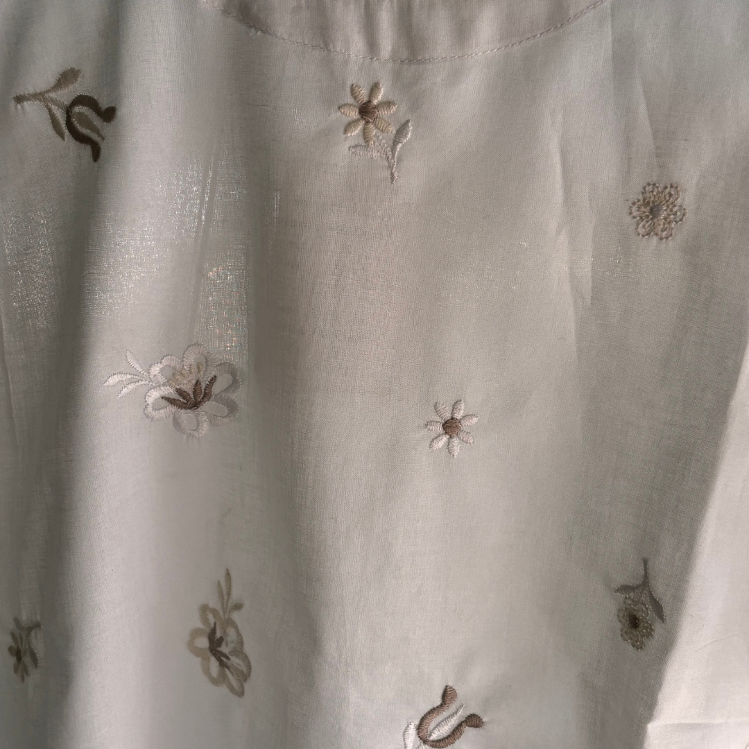 This elegant white cotton top is a versatile addition to your wardrobe, crafted for comfort and effortless style. The soft, breathable fabric ensures all-day wearability, while the delicate, hand-embroidered floral motifs add a timeless charm. It features a relaxed fit and short sleeves and’s perfect for casual outings, workwear, or weekend get-togethers.